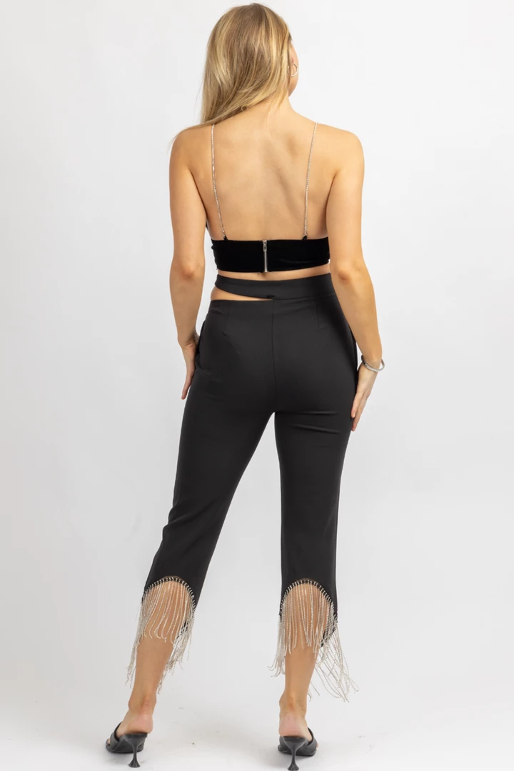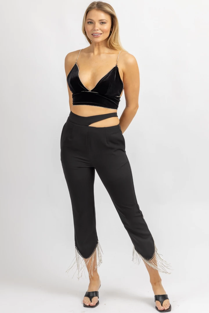 Sold together, Waist cutout detail, Side pockets, Diamante fringing on trouser legs create a sleek silhouette