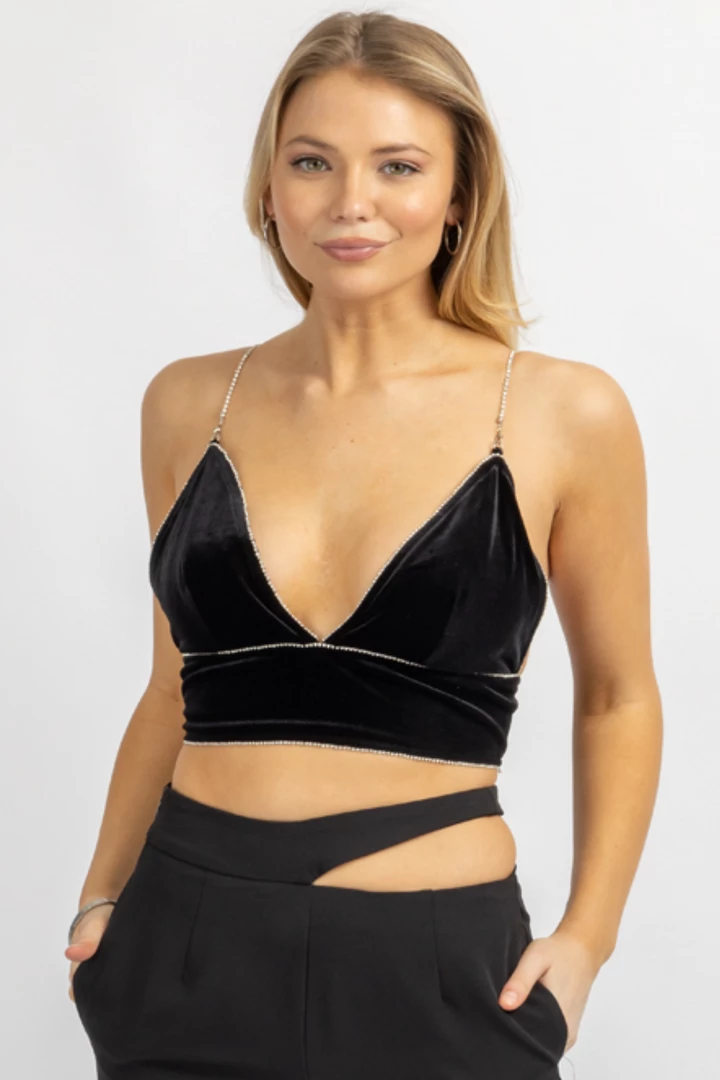 Velvet top with diamante strap detail, Concealed back zipper, Diamante trim