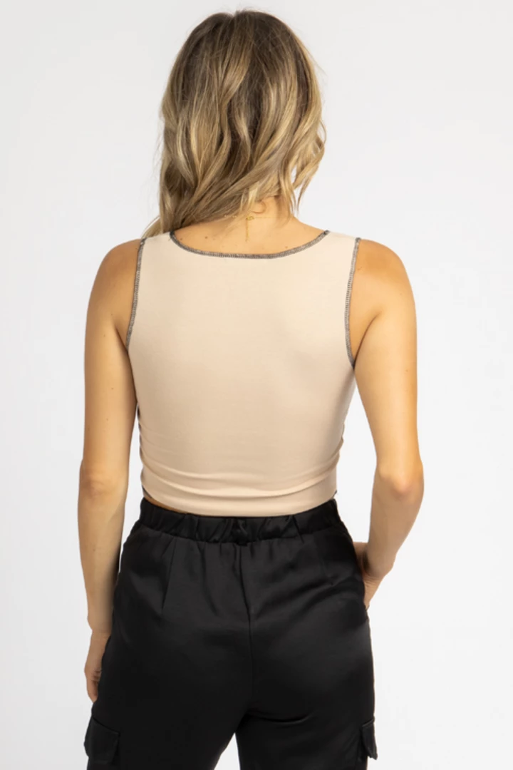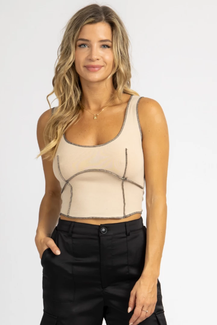 Exposed seam detail, Scoop neck, Slight crop, Sleeveless