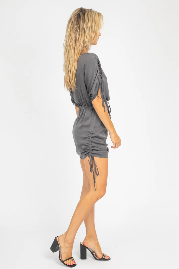 Off the shoulder mini dress feature cinched sleeves and side, Self tie waist and self ties with cinch