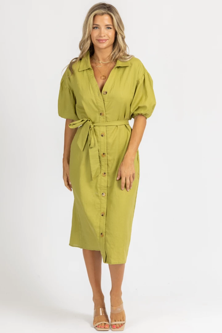Linen, Midi length, Short sleeves, Waist tie, Collared