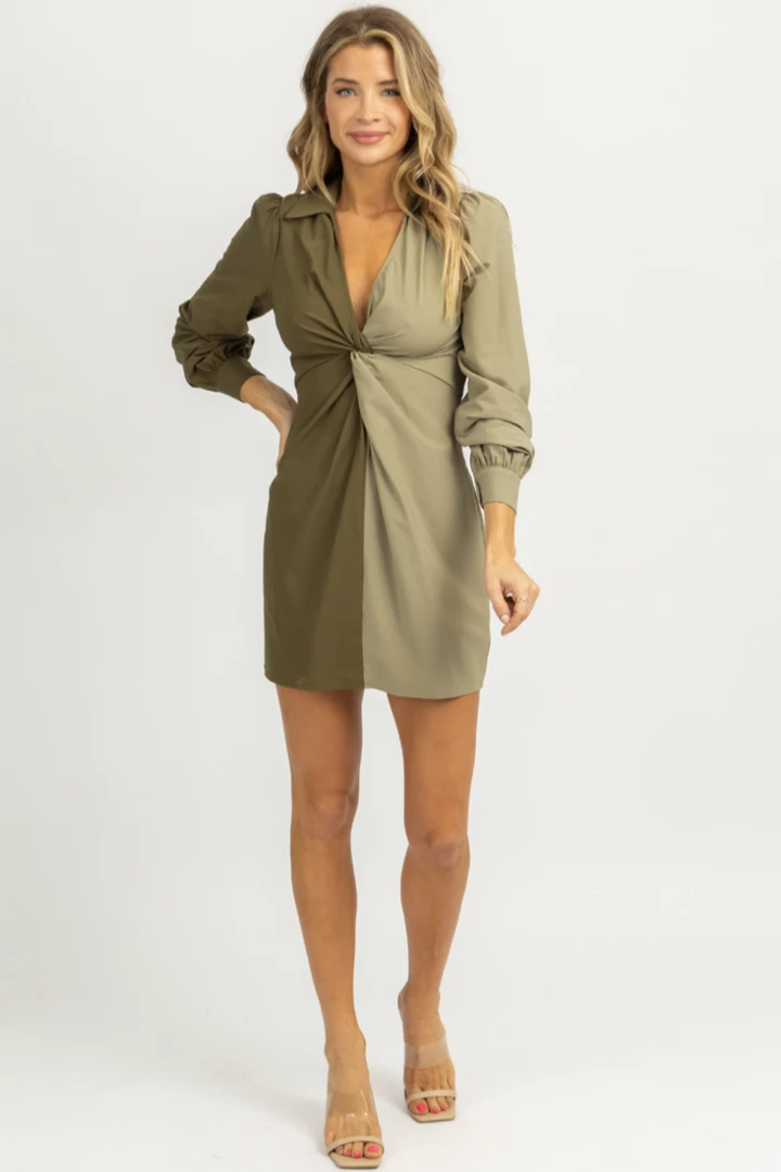 Twist front, Long puff sleeves, Collared, Color block detail, Mini dress