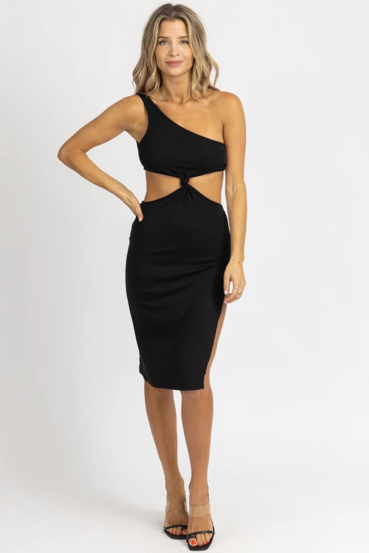Asymmetric shoulder, Side cutouts, Midi length, Fitted, Sleeveless