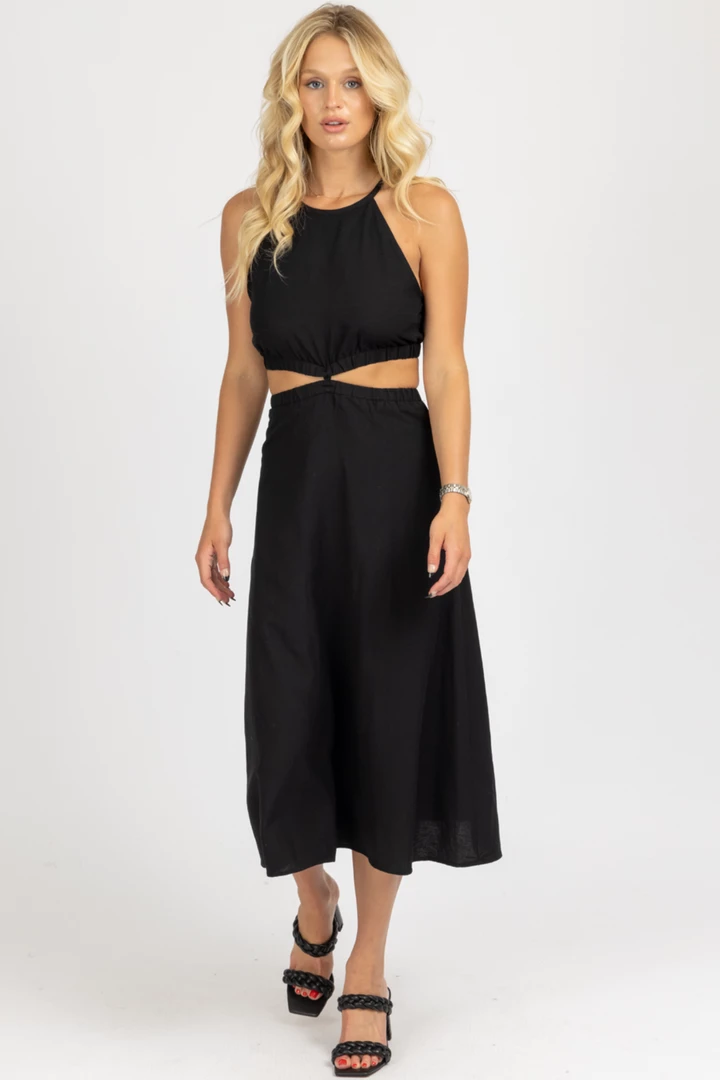 Open Back Midi Dress, Halter neckline, Detachable button closure at waistline, Elastic waistband with zipper closure at back, Button closure at back neck
