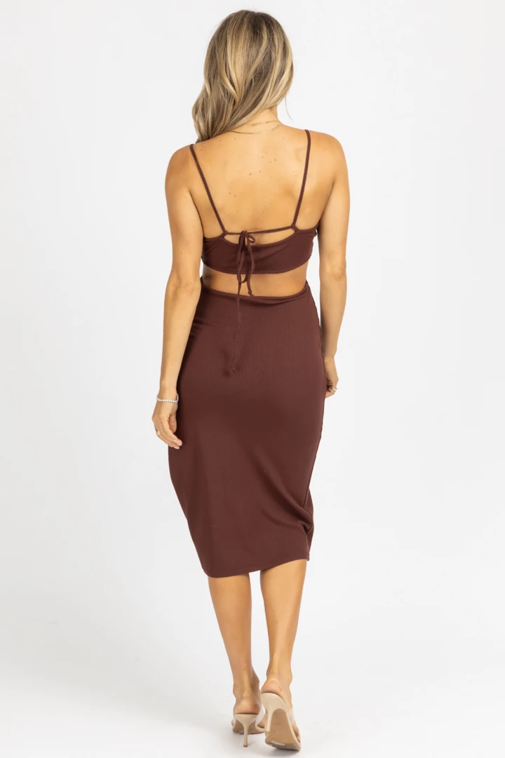 Midi length, O-ring detail, Cutout sides, Adjustable tie straps, Ribbed, Cross back