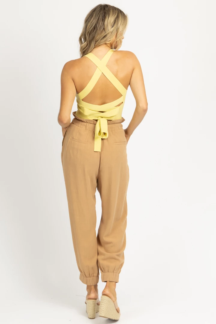 High waisted, Drawstring waist, Elastic banded ankle, Soft linen material