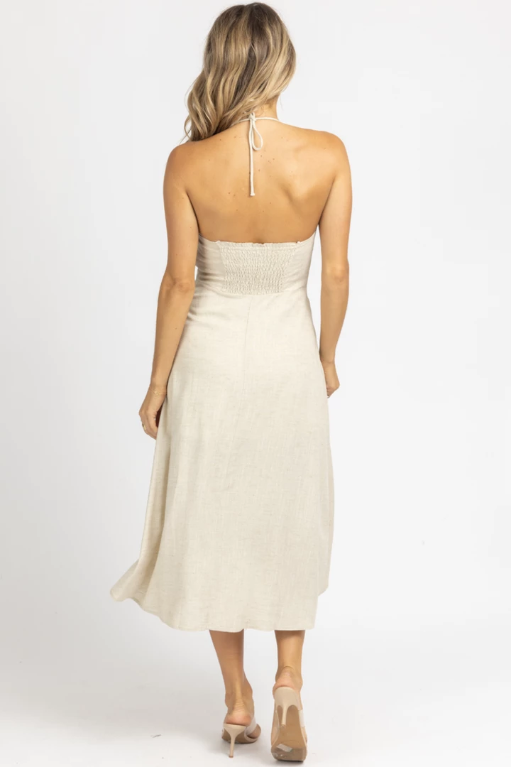 Bustier neckline, Halter tie neck, Midi length, Linen, Side slit