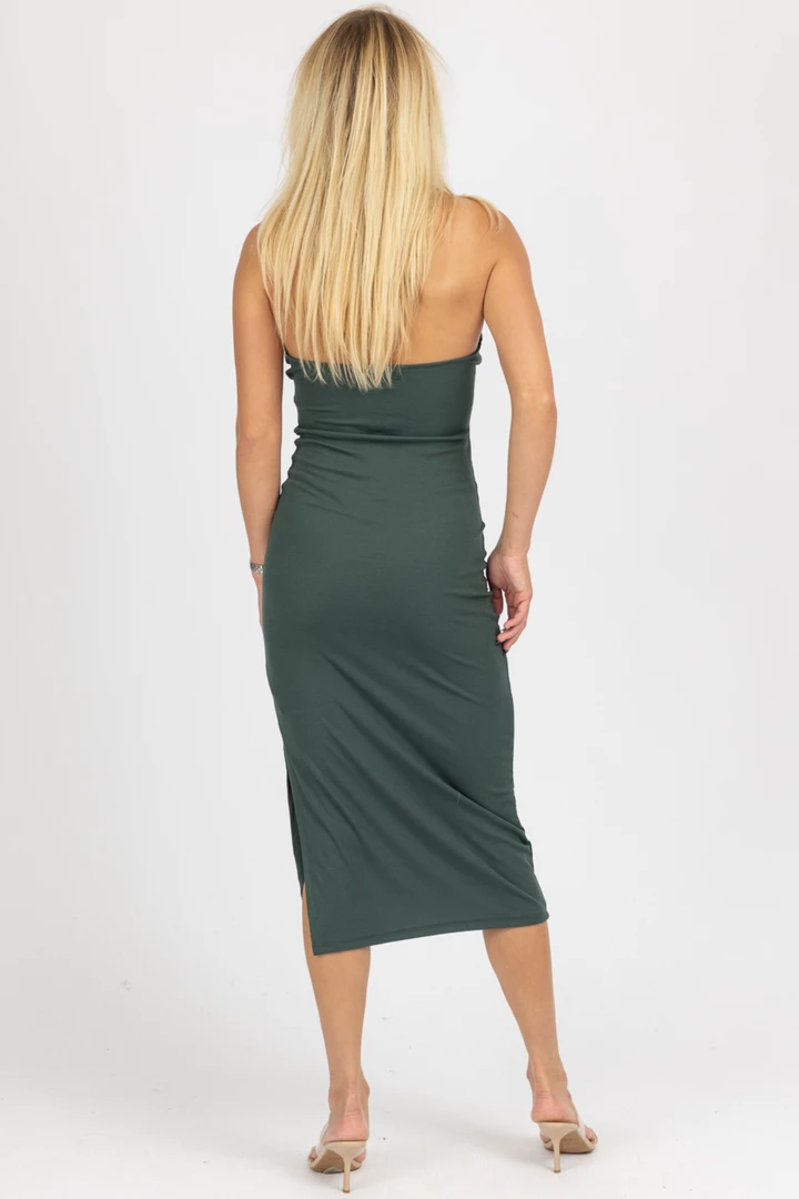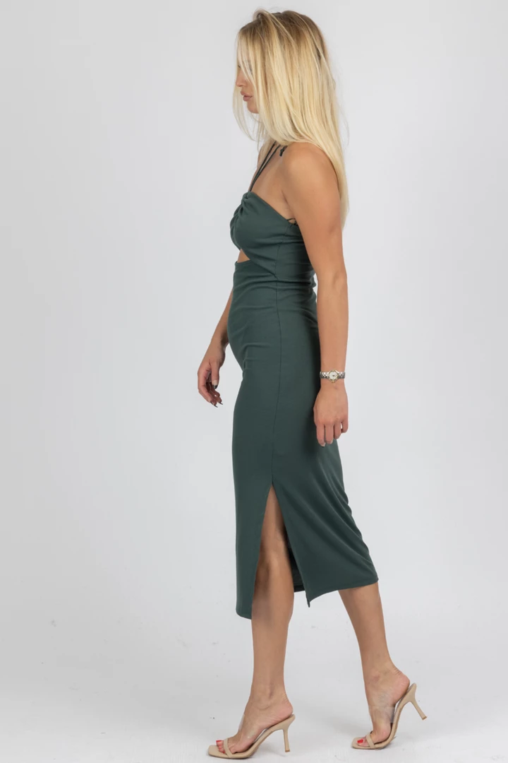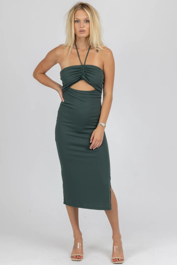 Ruched bust detail, Halter tie neck, Ribbed, Midi length, Cutout front