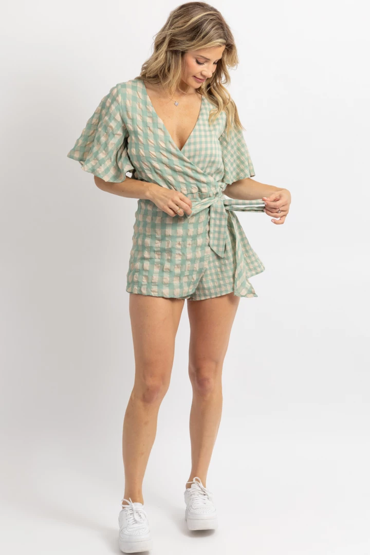 DAY + MOON NEW ARRIVALS GREEN + NATURAL GINGHAM WRAP ROMPER