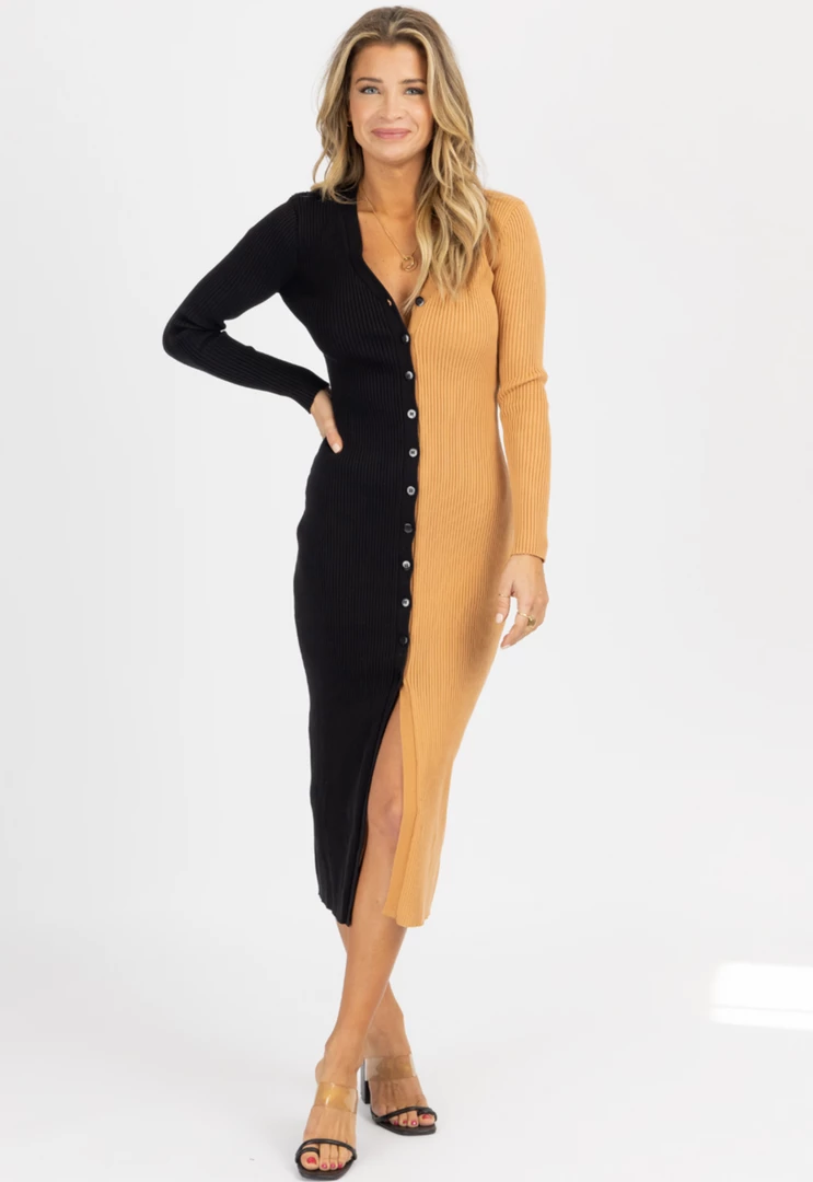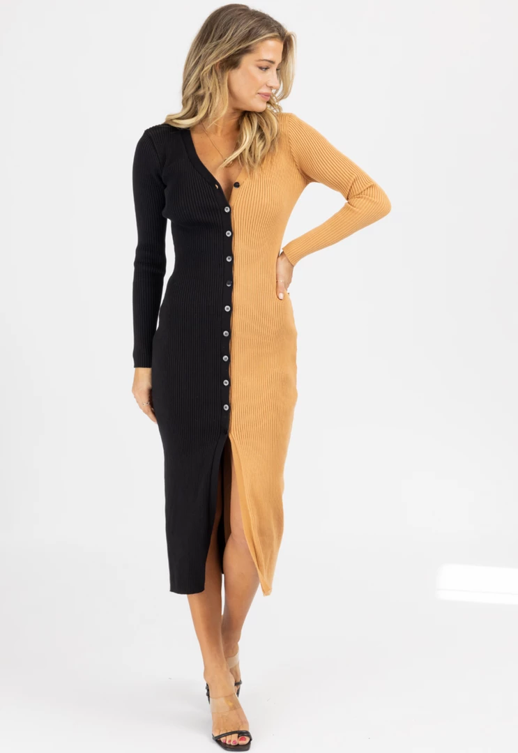 Knit, Ribbed, Button front detail, Long sleeves, Midi length, Form fitting