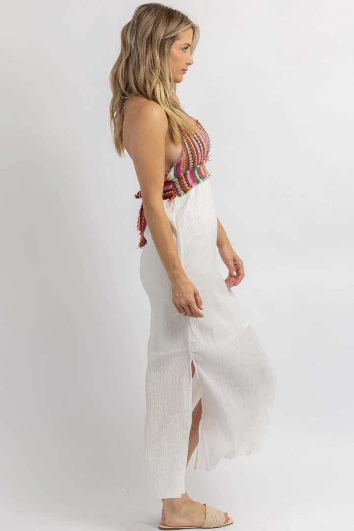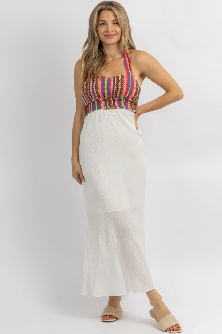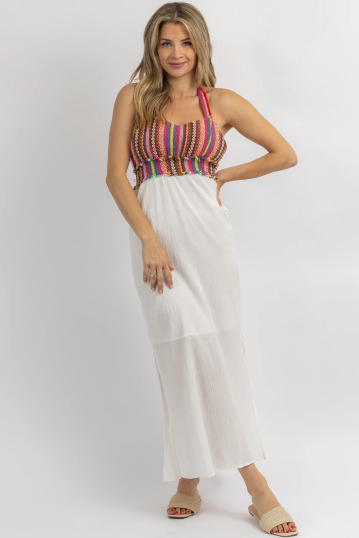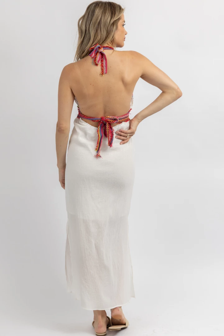 Backless, Halterneck, Maxi length, Multicolor crochet top detailing, Sleeveless