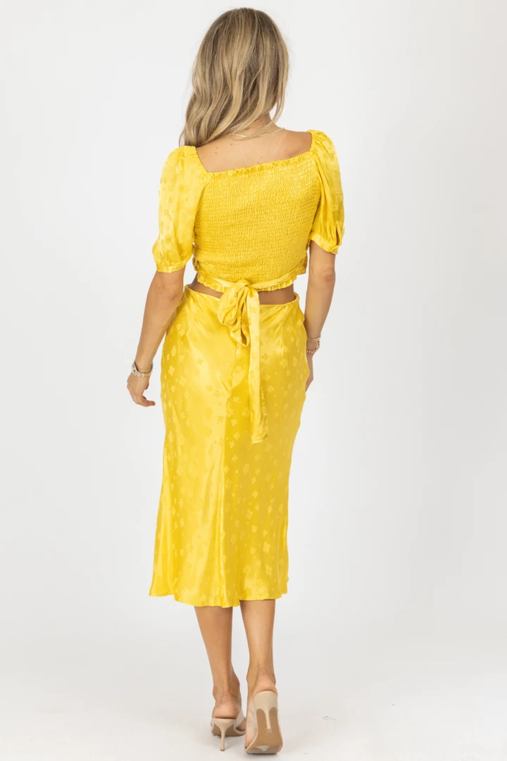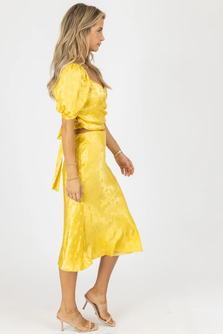 Sold together, Crop tie with side tie, Puff sleeves, Satinlike, Floral detail throughout, Midi skirt, High waisted, Back zip