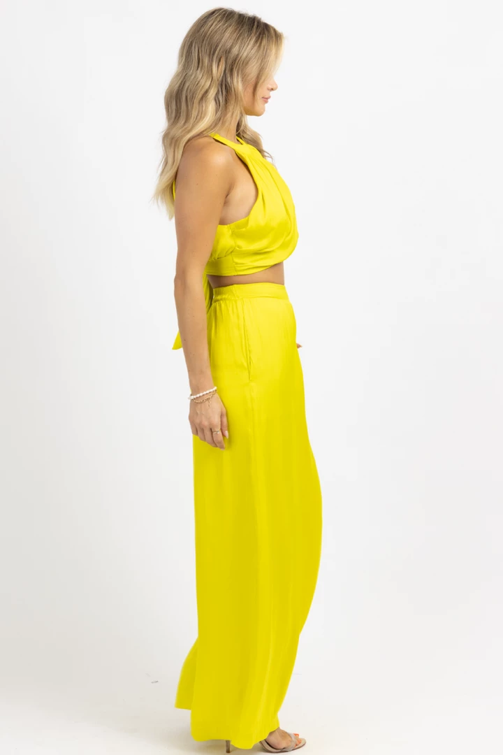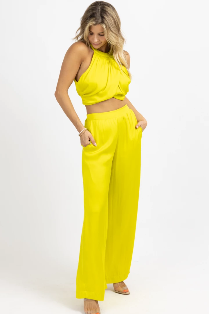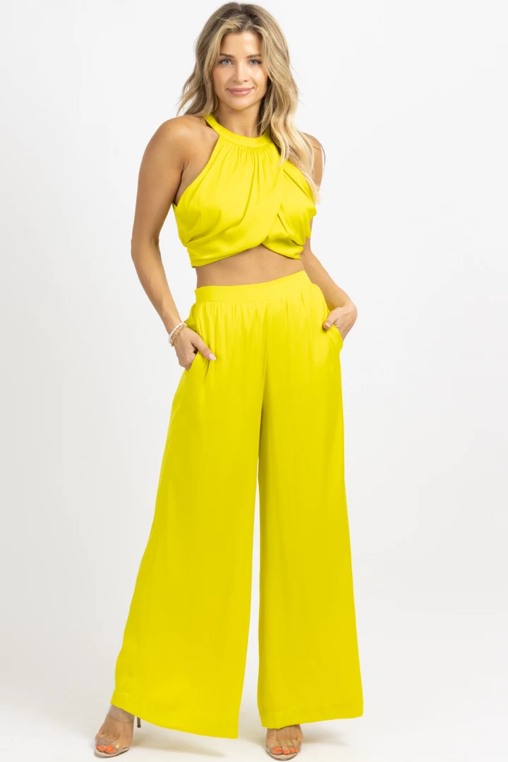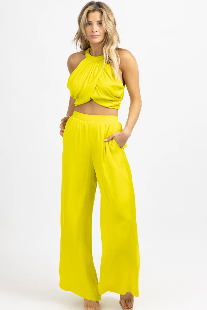 Sold together, Wide leg pant, High waisted, Elastic waist, Overlay sleeveless crop, Button back neckline