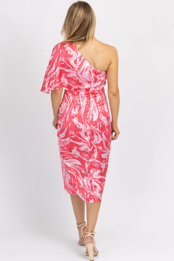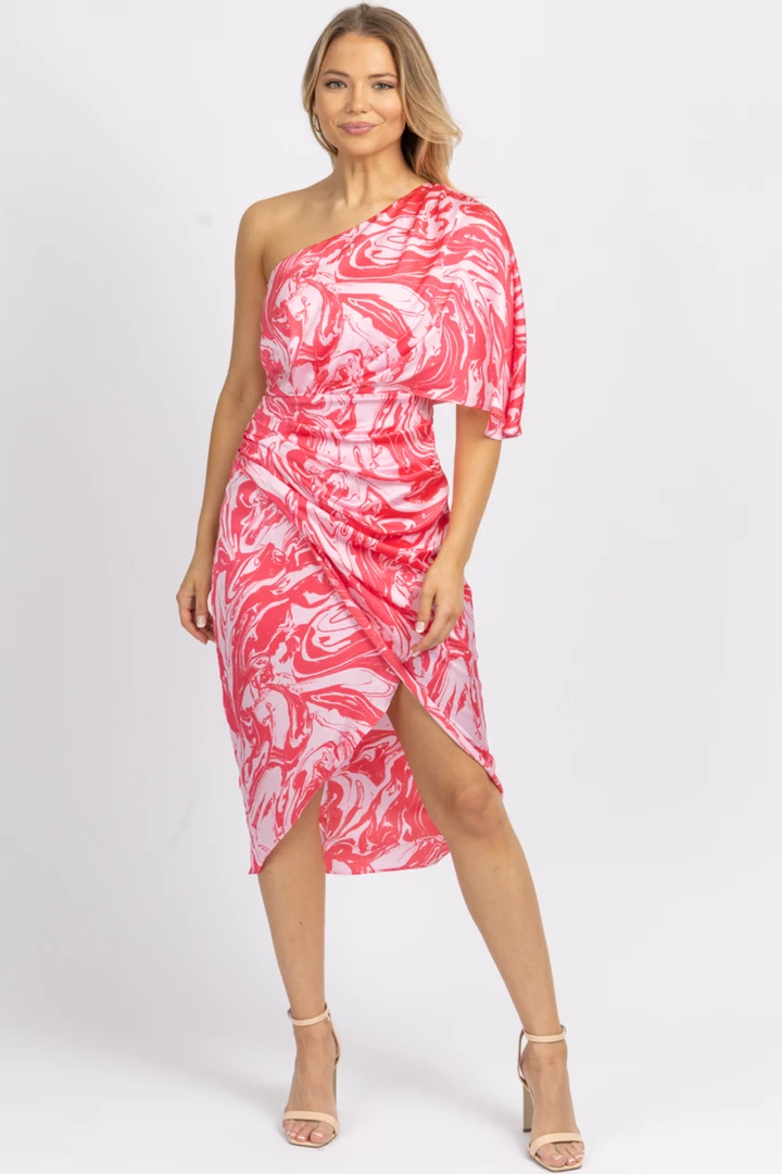 Satin, One shoulder, Marbled print, Ruched side, Asymmetric, Side zipper