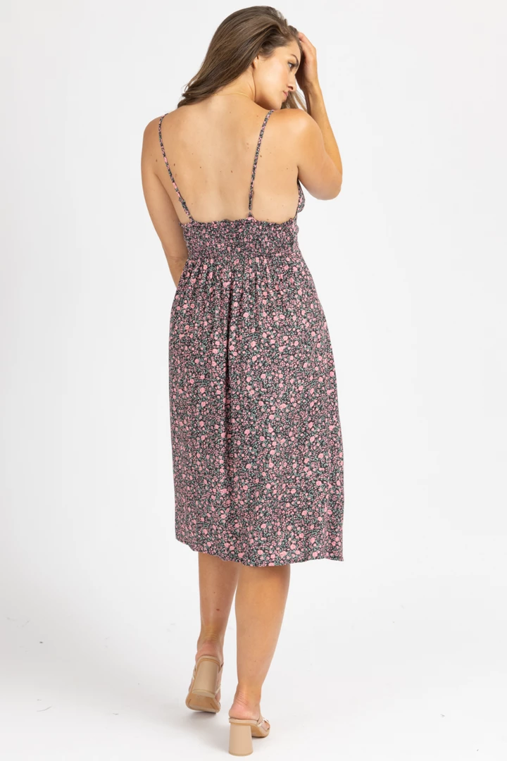 Triangle neckline, Spaghetti straps, Midi length, Floral, Adjustable straps, Smocked back
