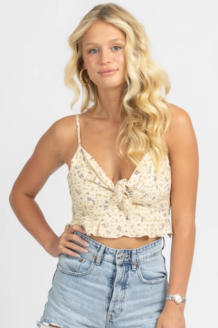 Cropped, Ruffled hem, Tie front, Spaghetti straps, Floral