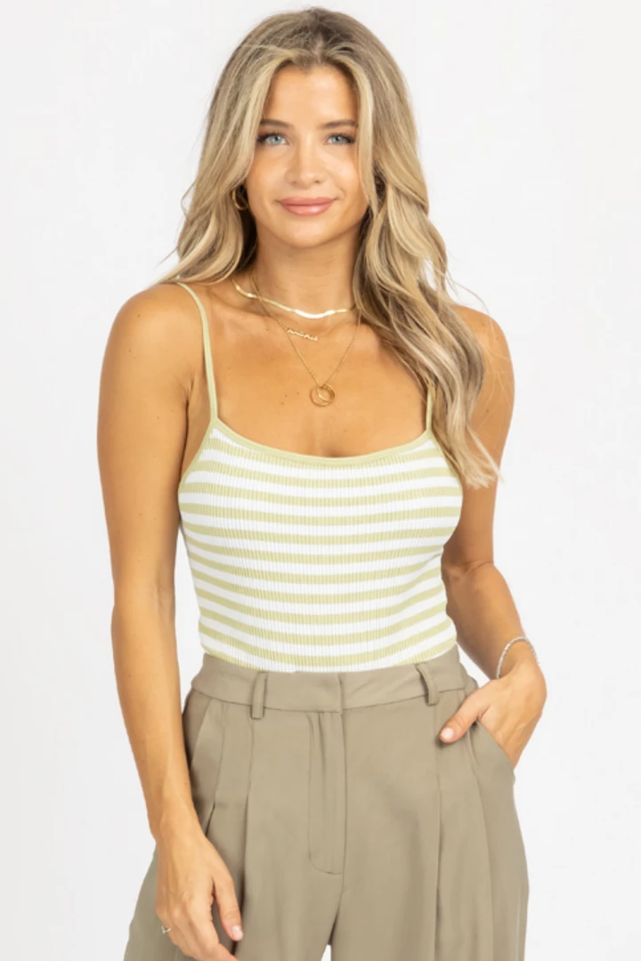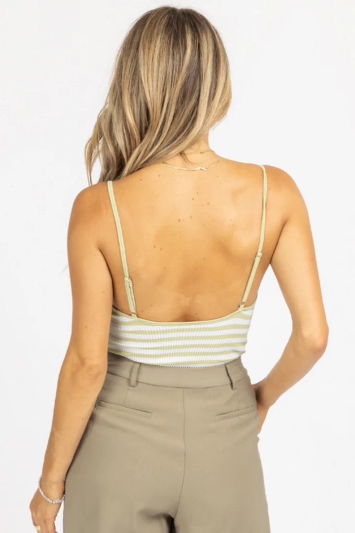 Striped, Low back detail, Ribbed, Spaghetti straps, Straight neckline, Snap closure, Thong bottom