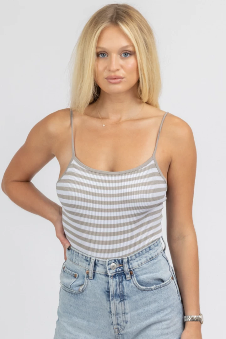 Striped, Low back detail, Ribbed, Spaghetti straps, Straight neckline, Snap closure, Thong bottom