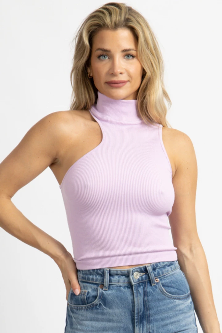 Ribbed, One shoulder cutout, Sleeveless, Fitted, Mock neckline