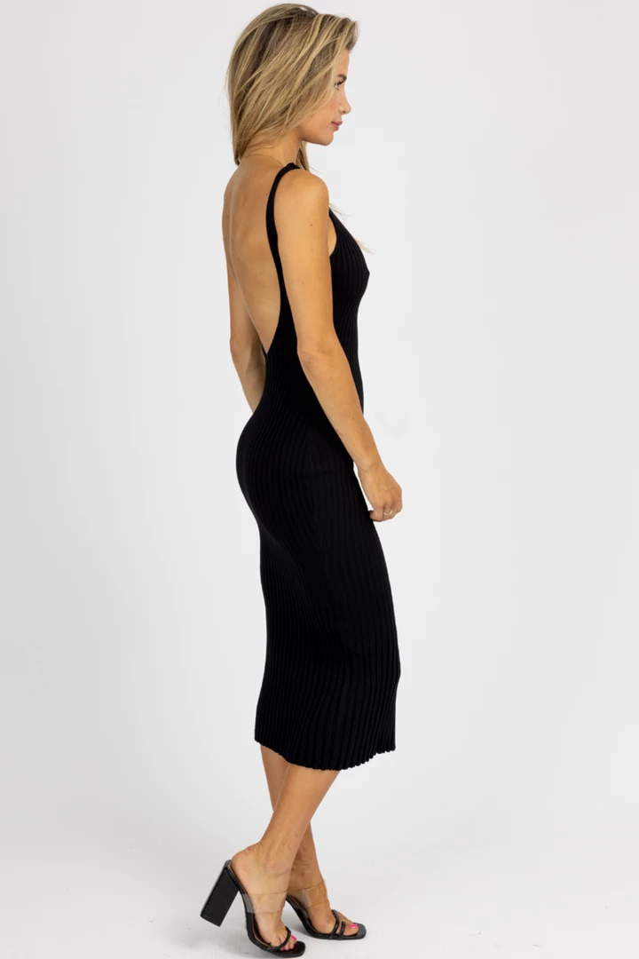 Maxi length, Thick knit rib, Scoop back, Spaghetti straps, Form fitting