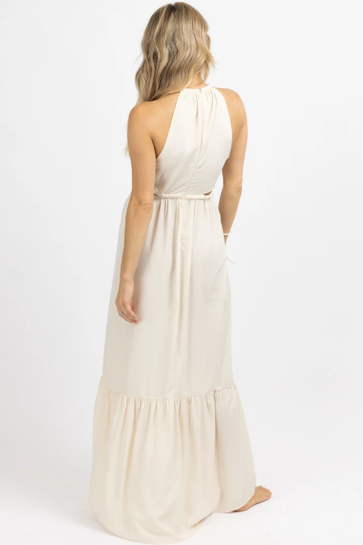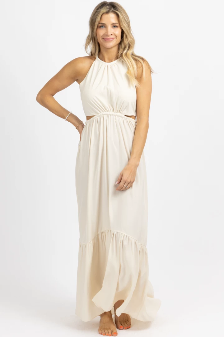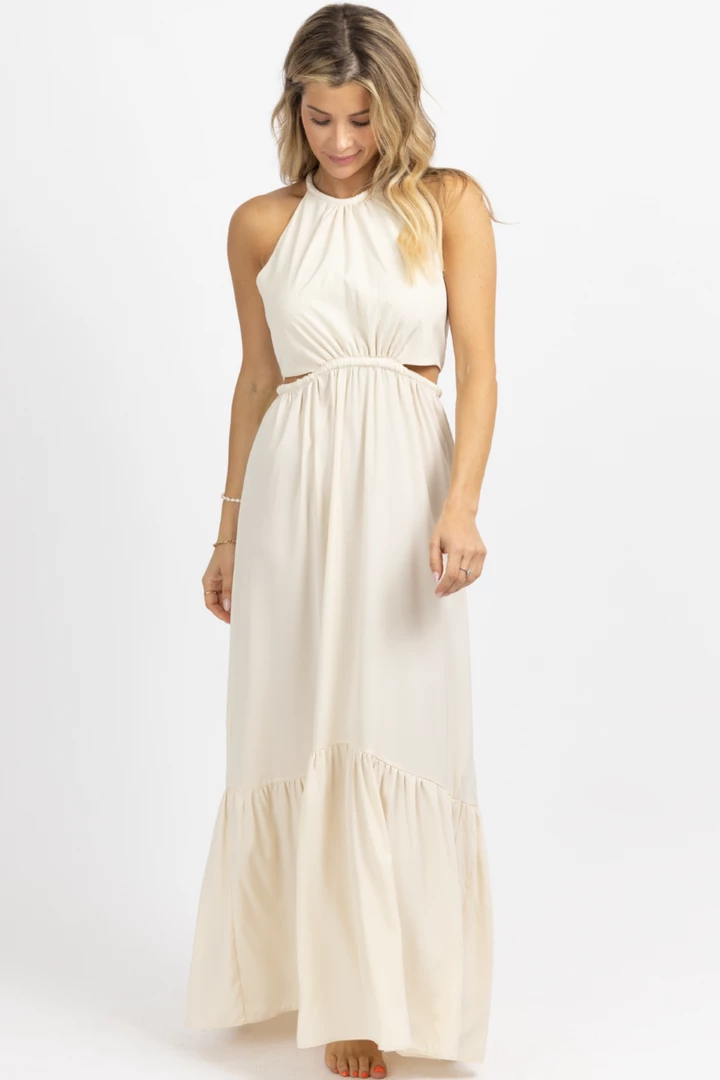 High rise halter neck, Open sides, Maxi length, Relaxed fit