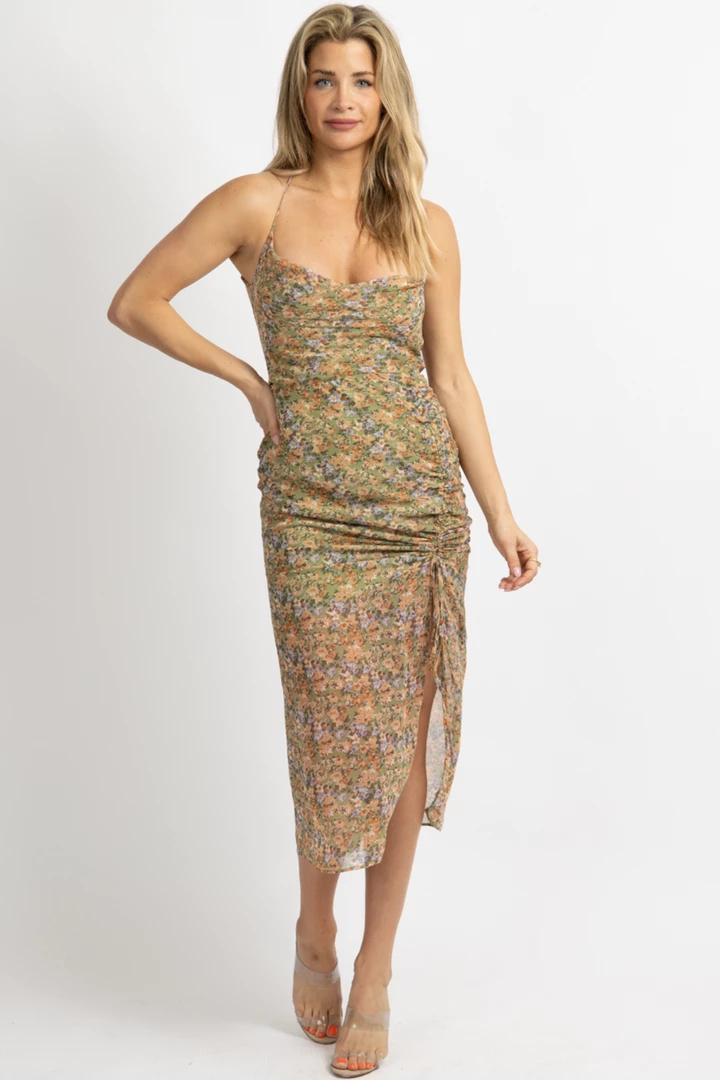 Shirred, Sheer with liner, Side tie detail, Strapless, Floral, Sleeveless