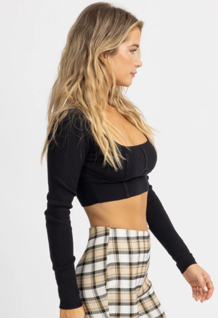 Knit, Cropped, Long sleeves, Self piping detail throughout, Square neckline
