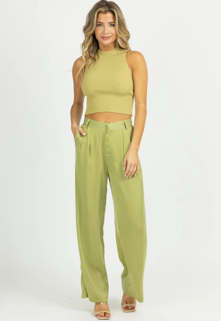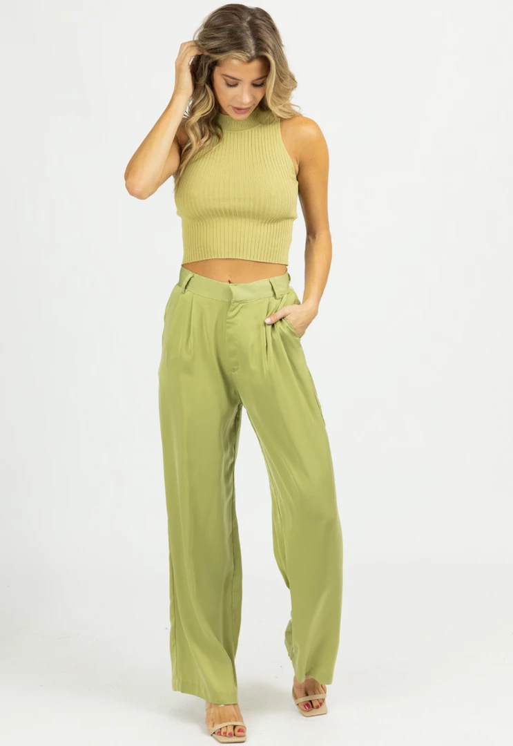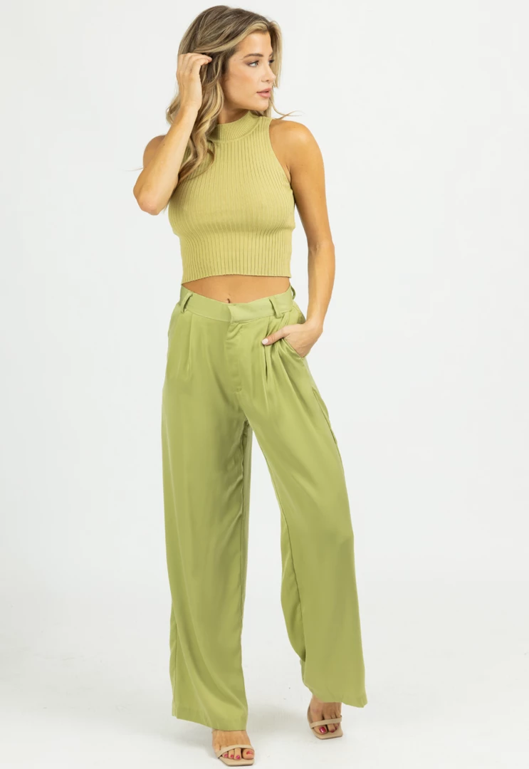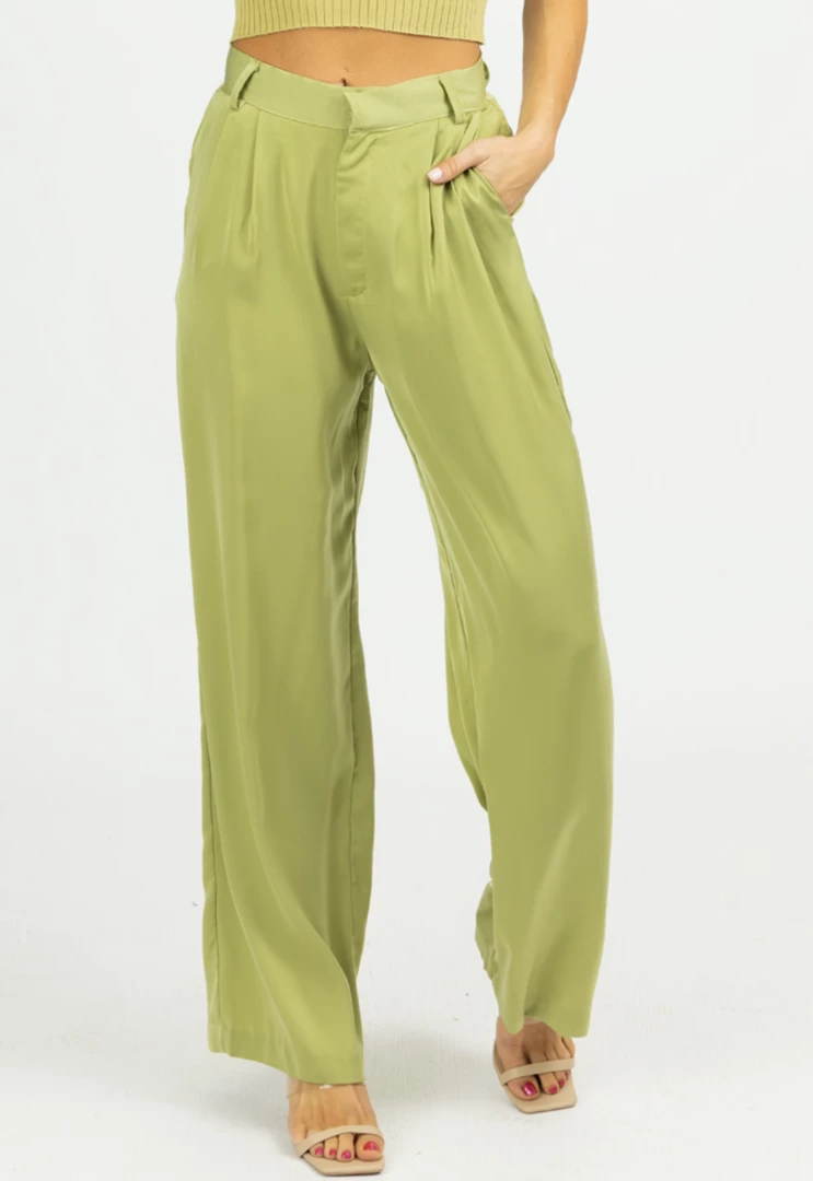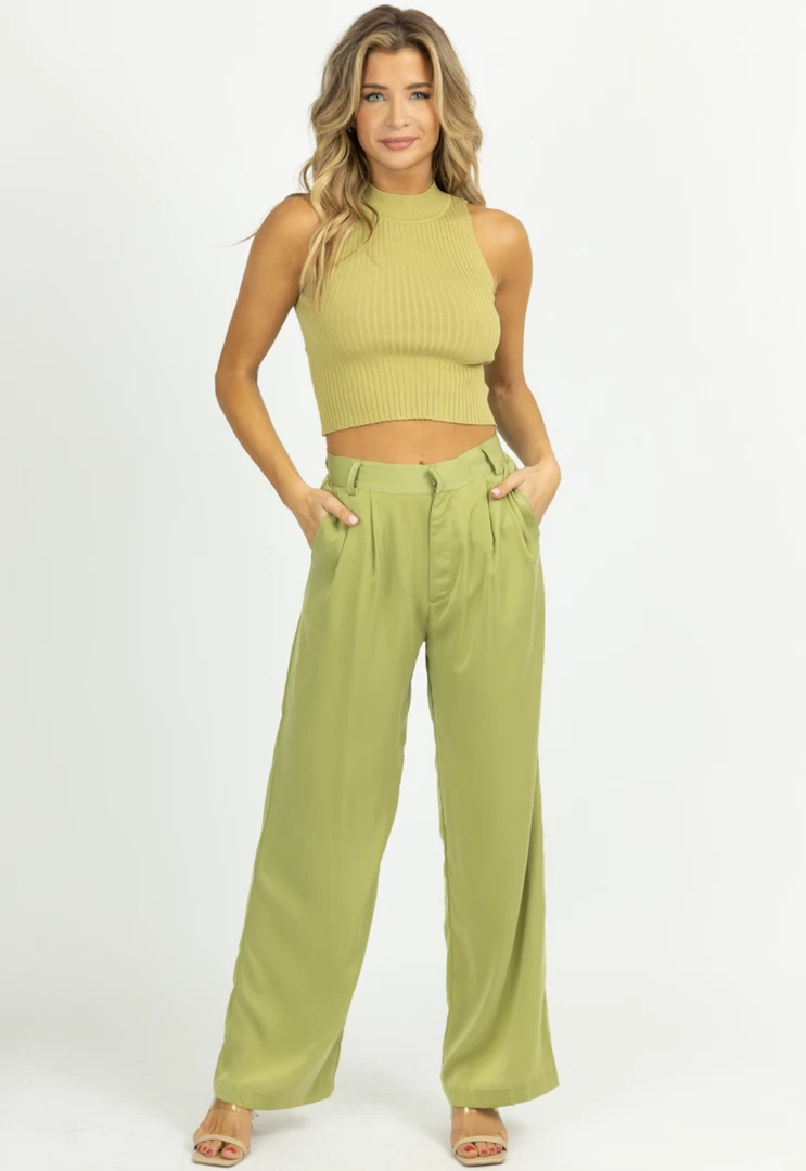 High waisted, button closure, Zip front, Pleated, Wide legs
