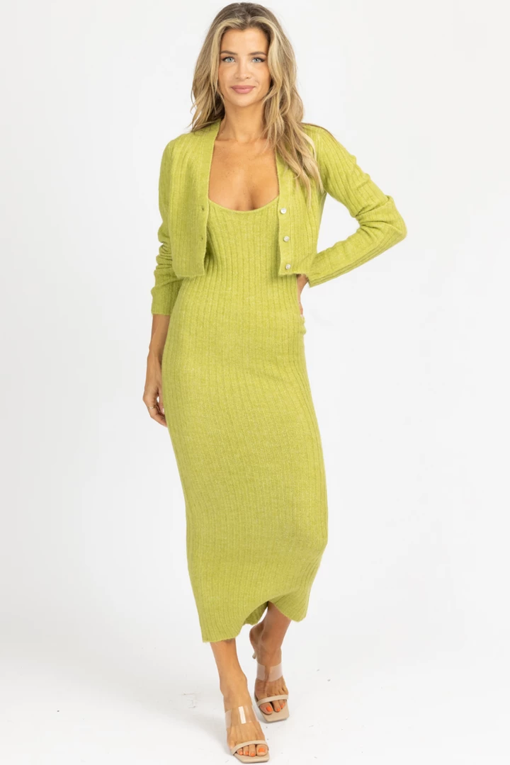 Maxi length, Sold together, Button front cropped cardigan, Spaghetti strap maxi, Knit, Fitted