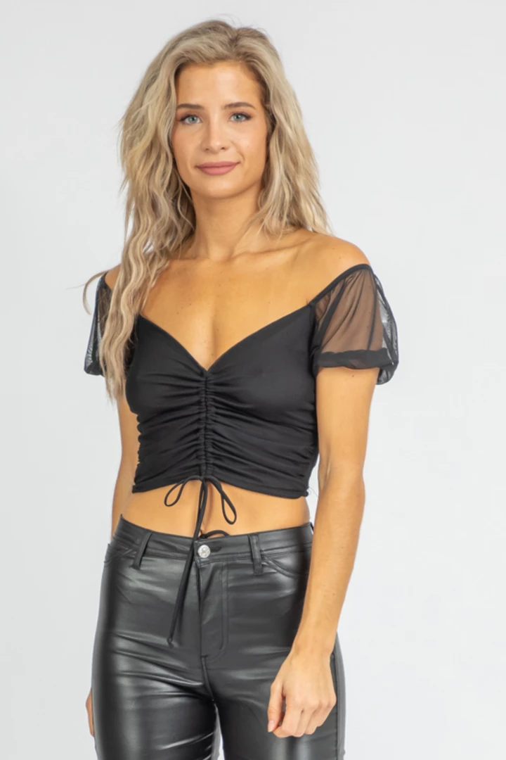 Cropped, Mesh, Cinched sleeves, Tie front ruche