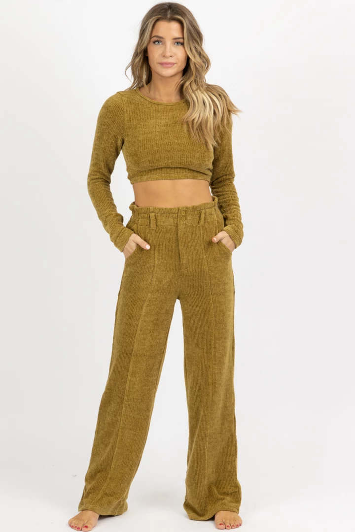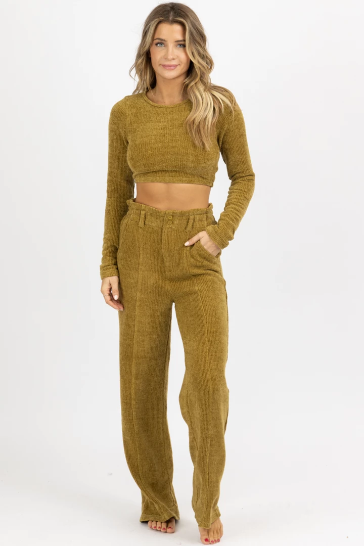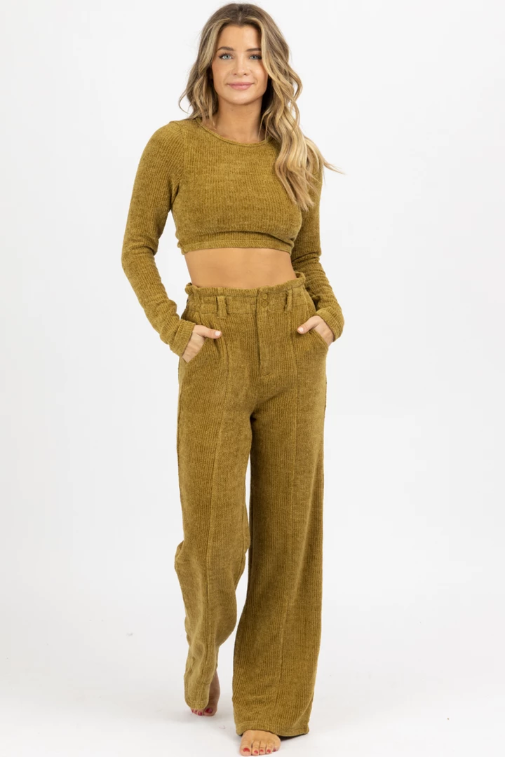 Sold together, High waisted paperbag pants, Button detail, Pockets, Long sleeve crop with open tie-back detail, Crew neckline