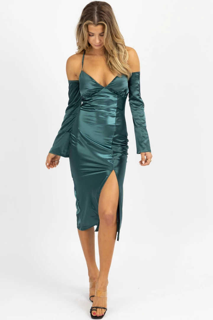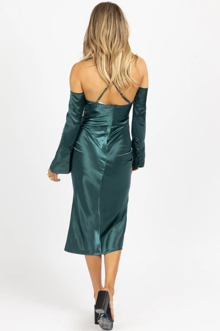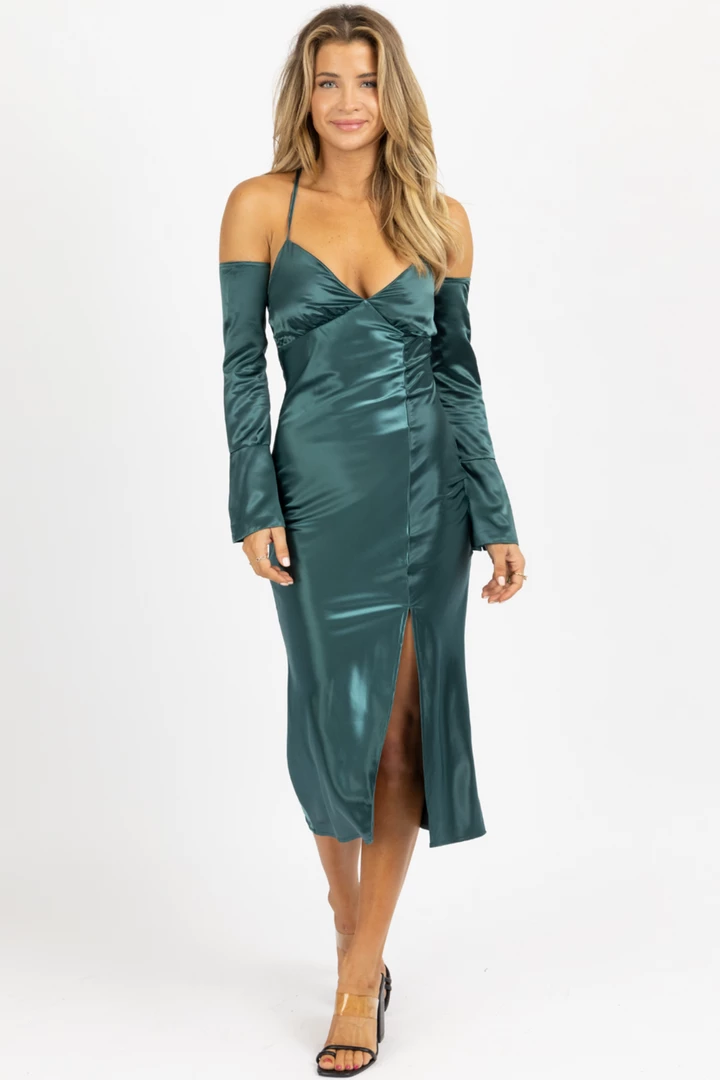 Maxi length, Satin, Side slit, Long cuff sleeve detail, Adjustable straps