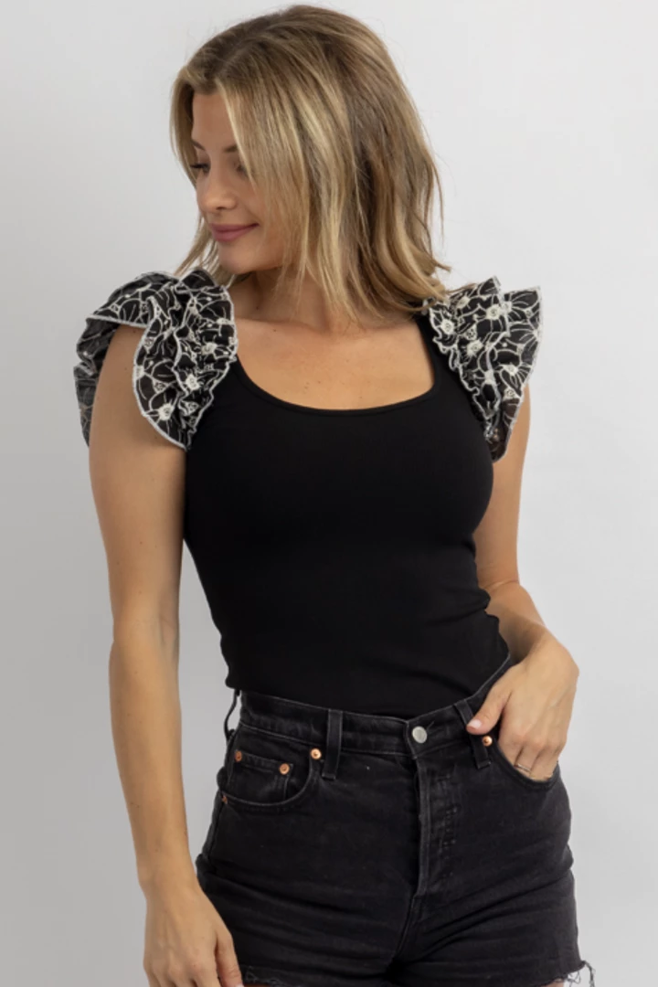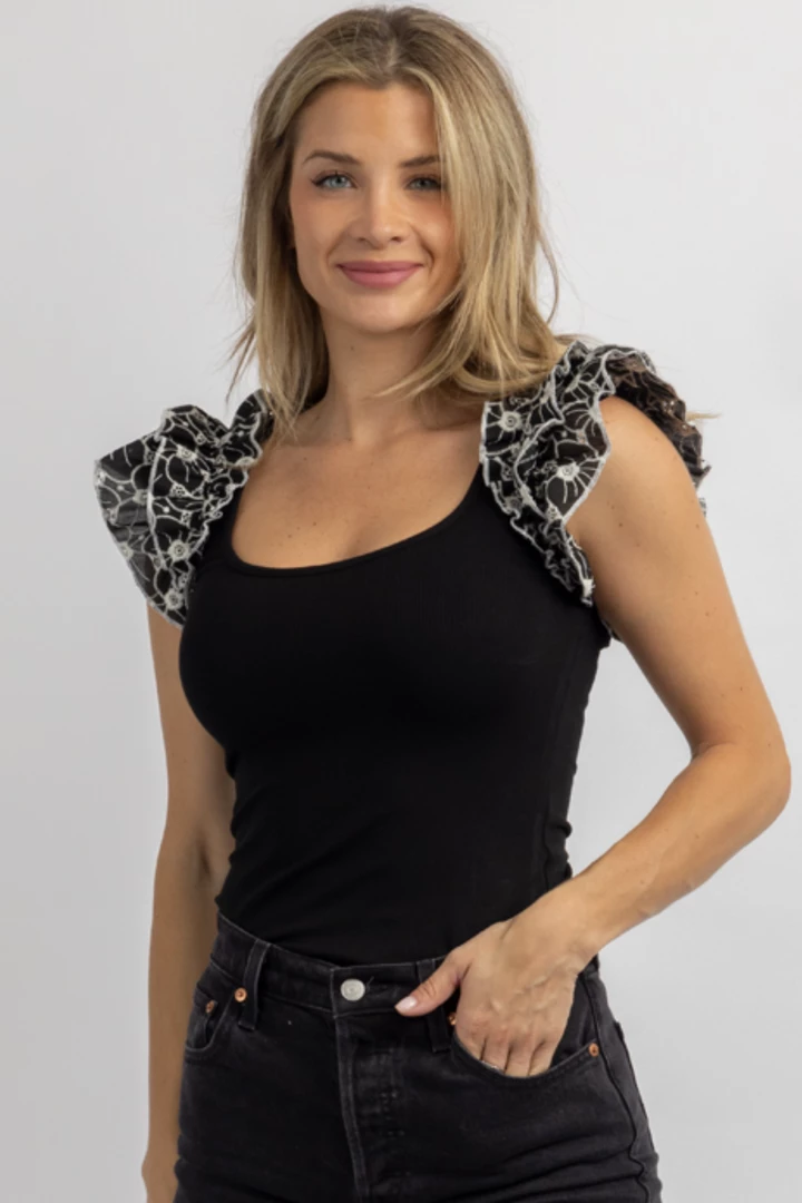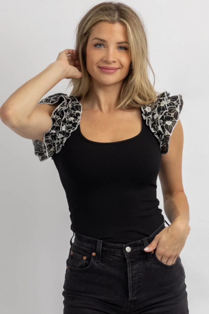 Floral ruffled strap detail, Fitted, U-neckline, Sleeveless, Stretch