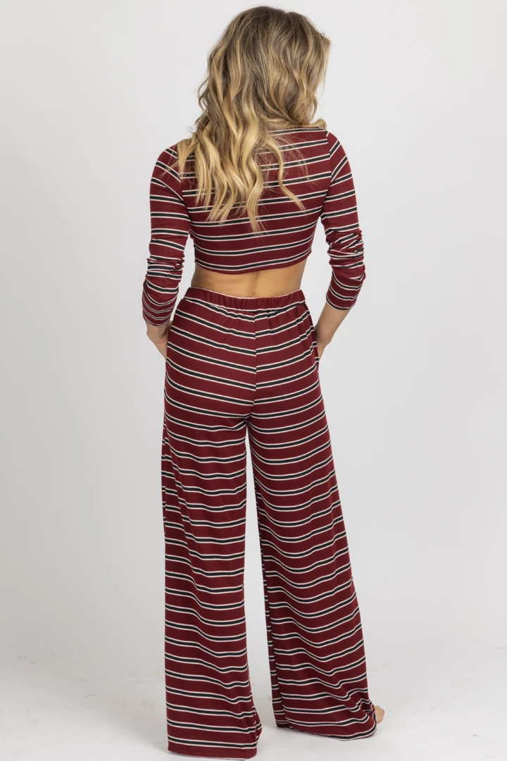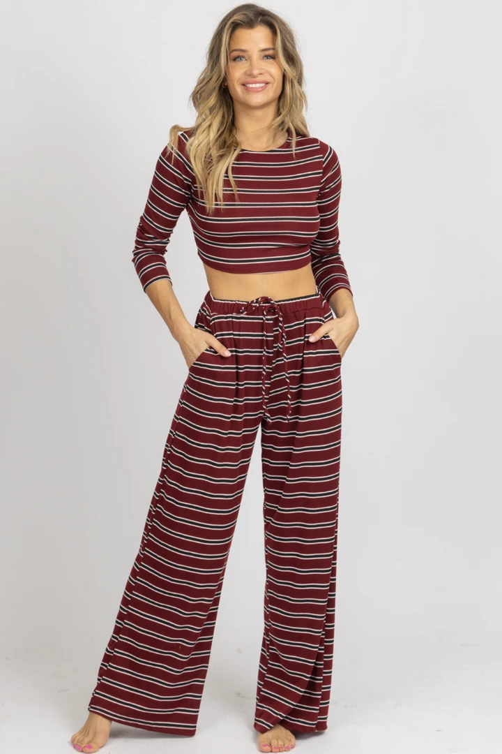 Sold together, Long sleeves, Ribbed, Cropped, High rise flare pant, Striped, Drawstring waist