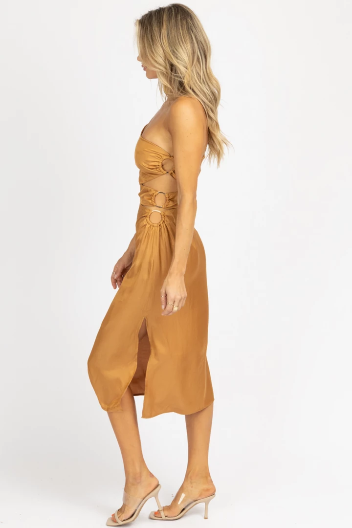 ENDLESS BLU CARAMEL O-RING SATIN ONE SHOULDER MIDI DRESS NEW ARRIVALS