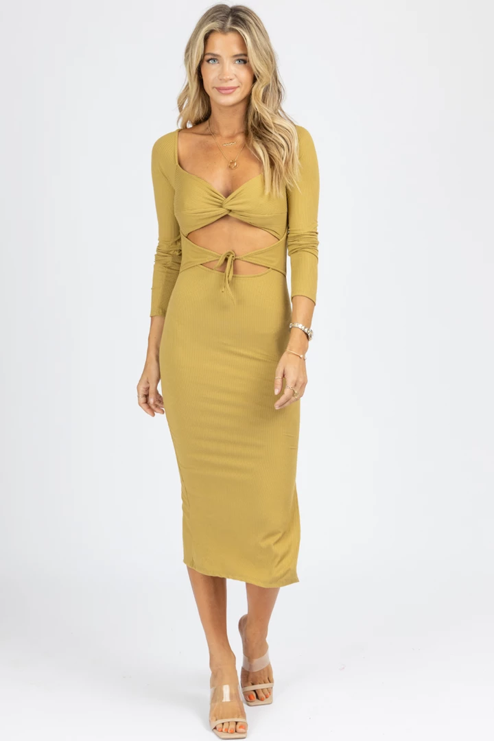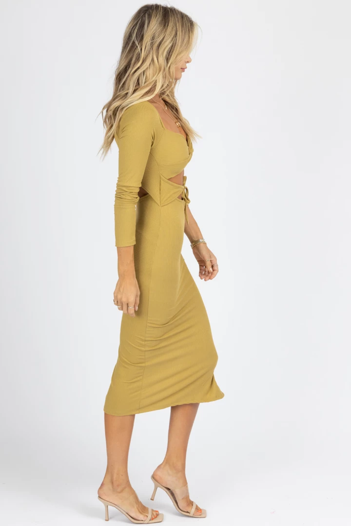 Midi length, Fitted, Long sleeves, Front cutout with tie detail, Fitted