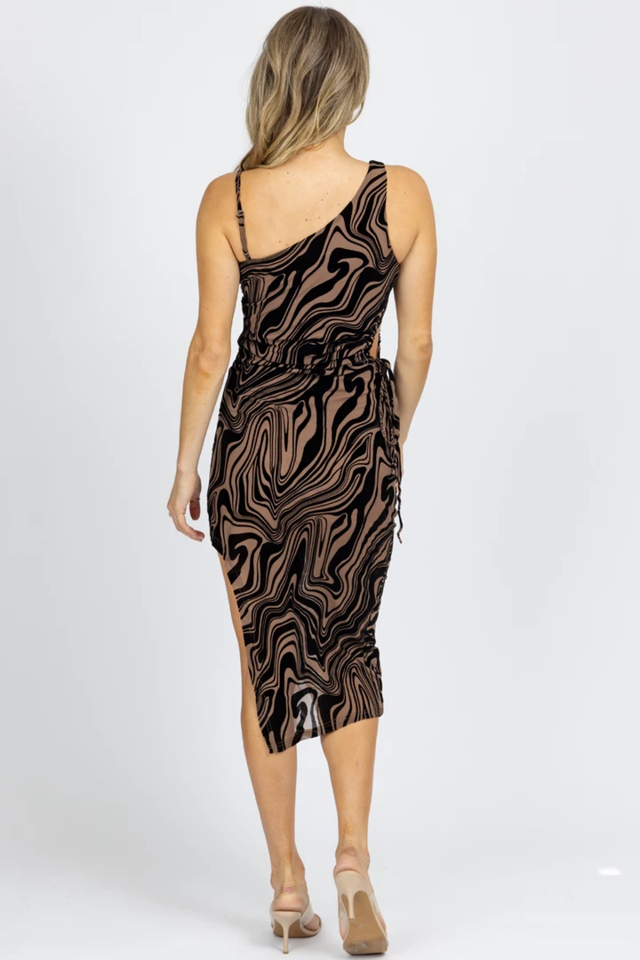 One shoulder, Fitted, Asymmetric hemline, Abstract print, Side cutout with self-tie ruching
