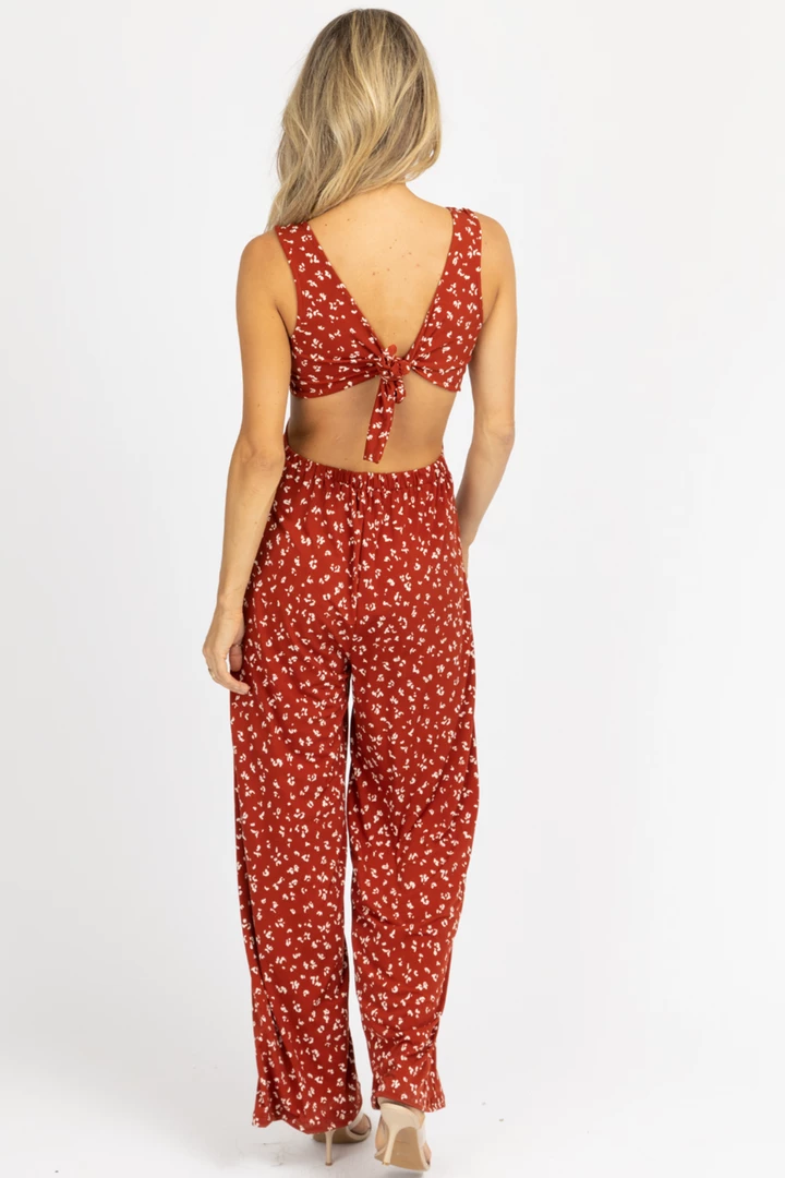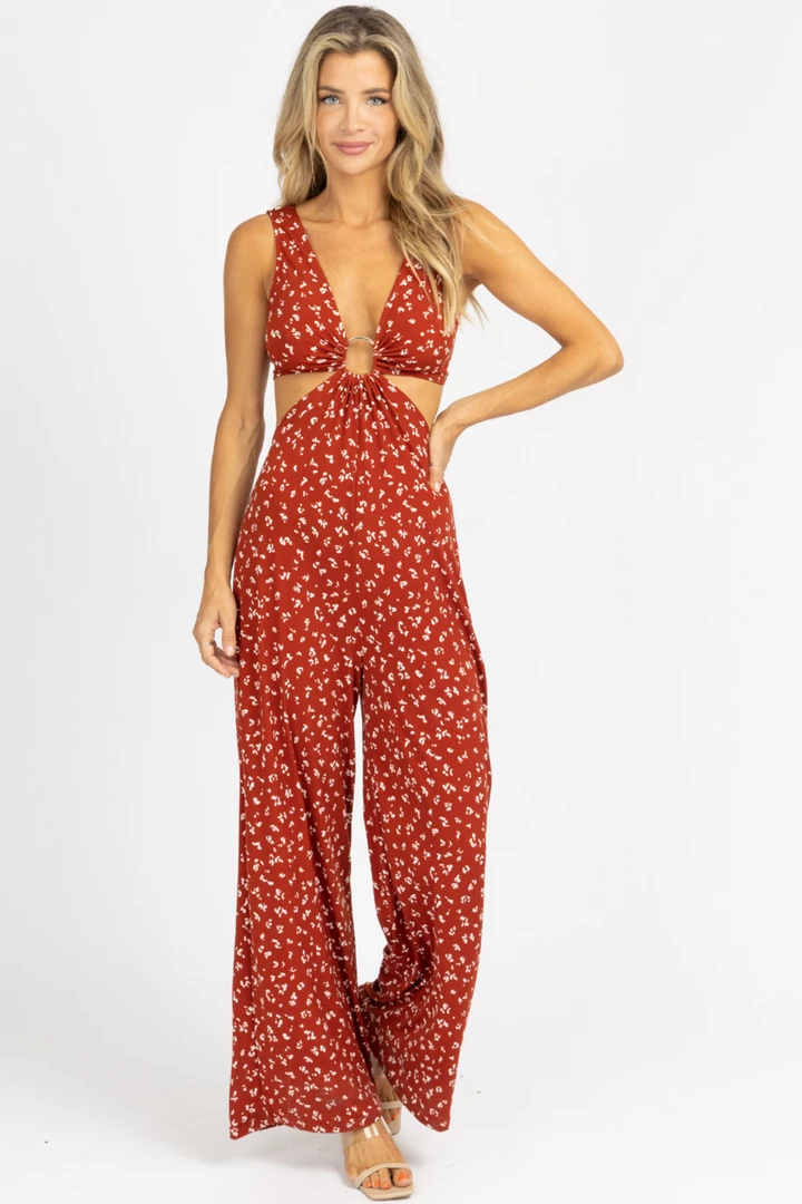 Sleeveless, O-ring, Jumpsuit, Flare leg, Open sides, Floral