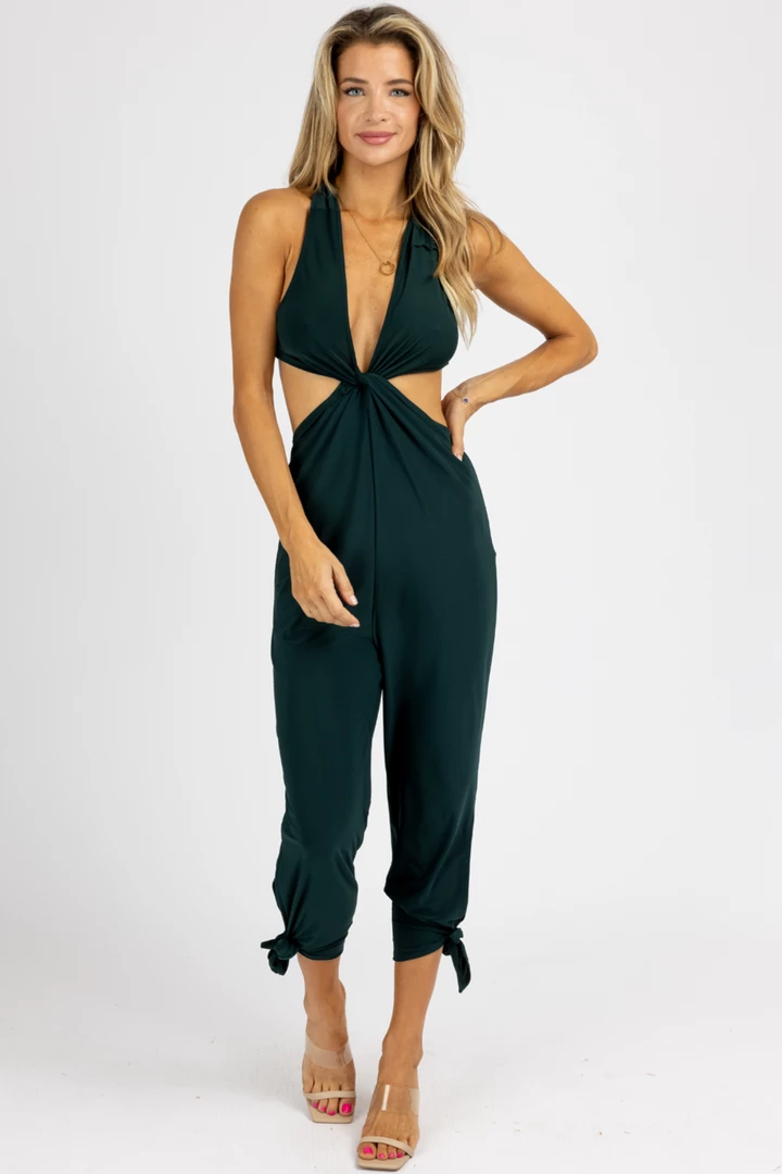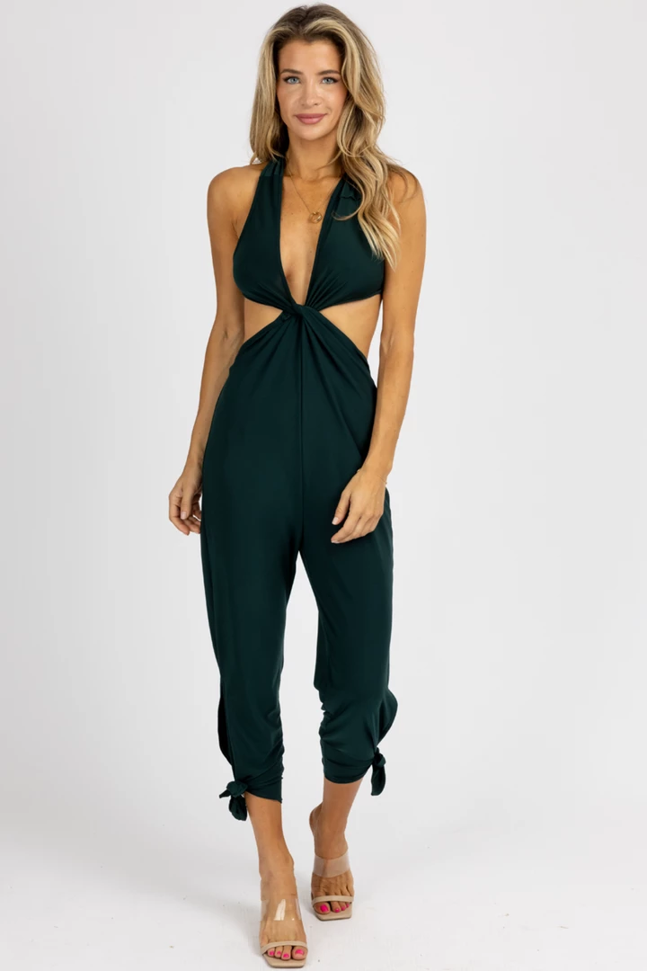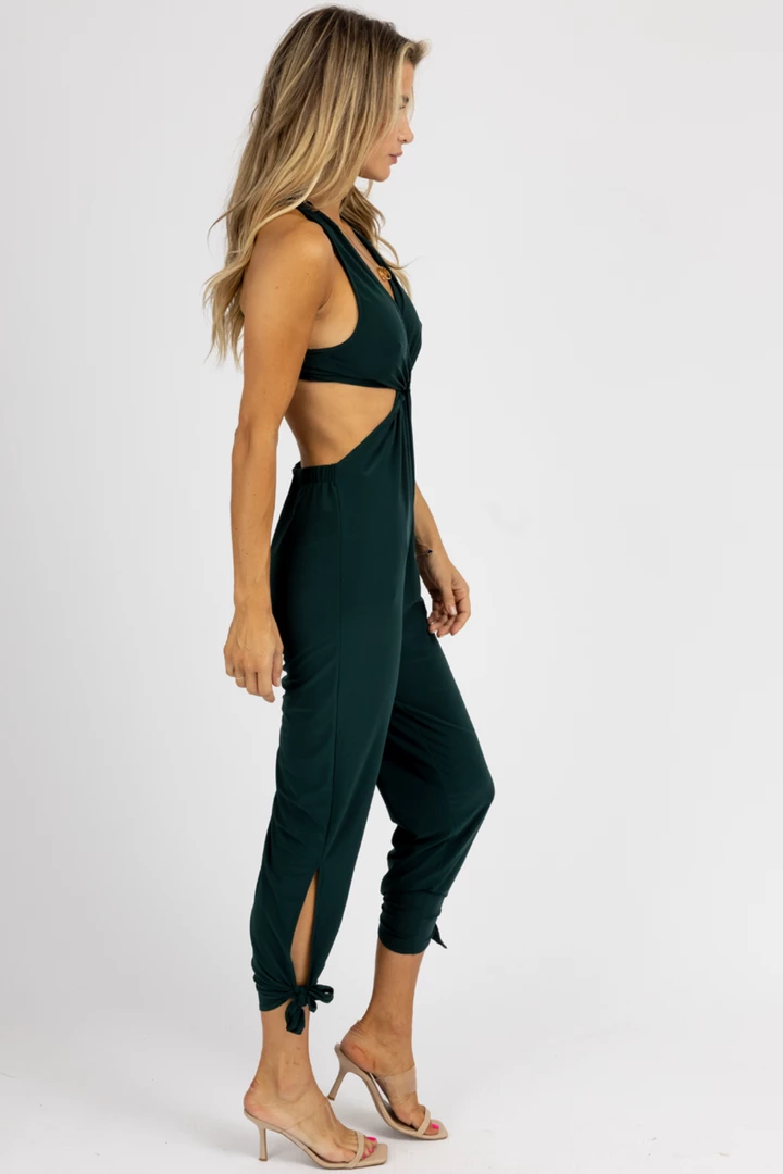 Stretch knit, Side cutouts, Sleeveless, V-neck, Open leg detail with tie
