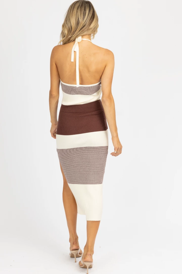 Maxi length, Ribbed, Halterneck, Self tie neck, Striped contrast detail, Fitted
