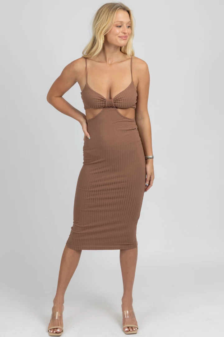 Cutout detail, Spaghetti straps, Ribbed, Fitted, Midi length