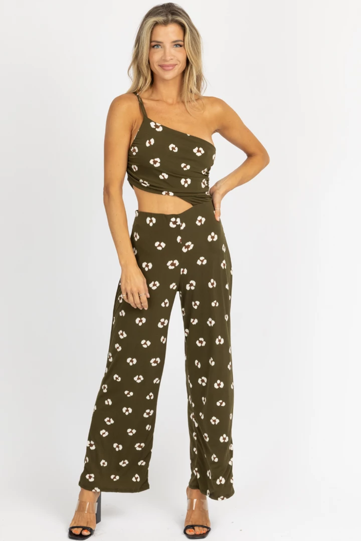 Open side cutout detail, One shoulder, Flare pant, Abstract print