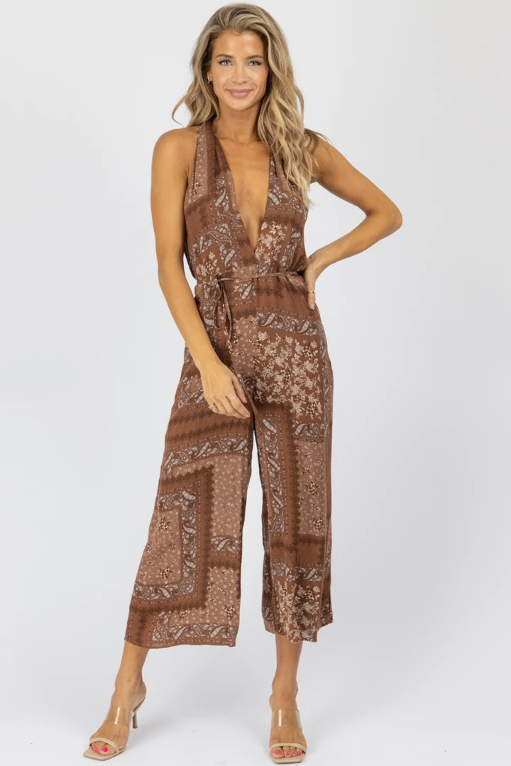 Halter neckline with wrapped back detail, Sleeveless, Linenlike, Wide leg