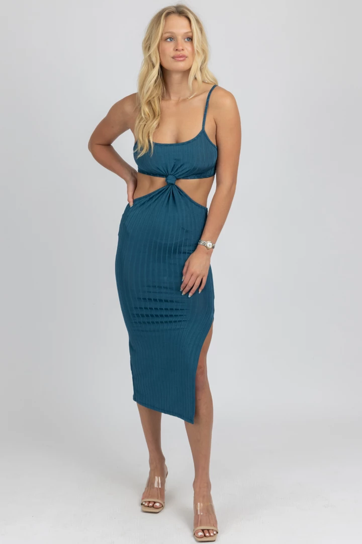 Silky rib fabrication, Knot front detail, Open side and back, Midi length, Side slit