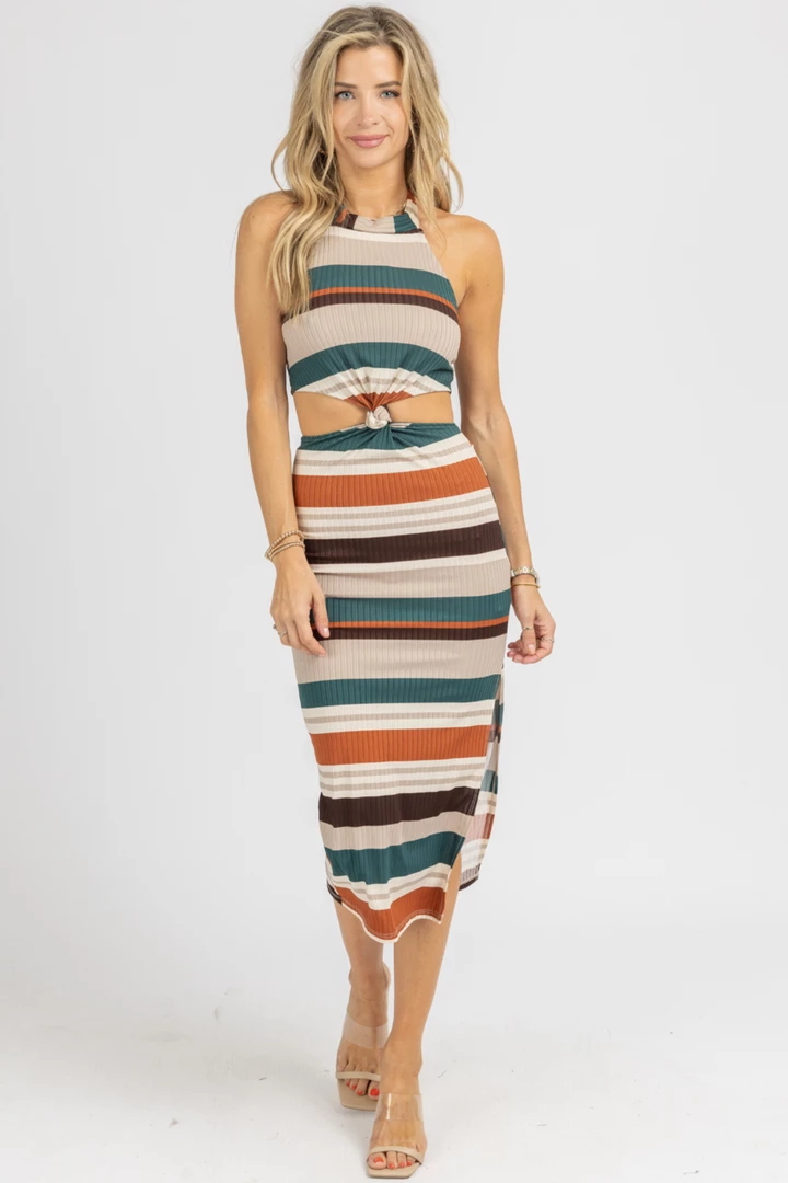 Ribbed, Midi length, Cutout detail, Front twist knot, Halter neck, Striped