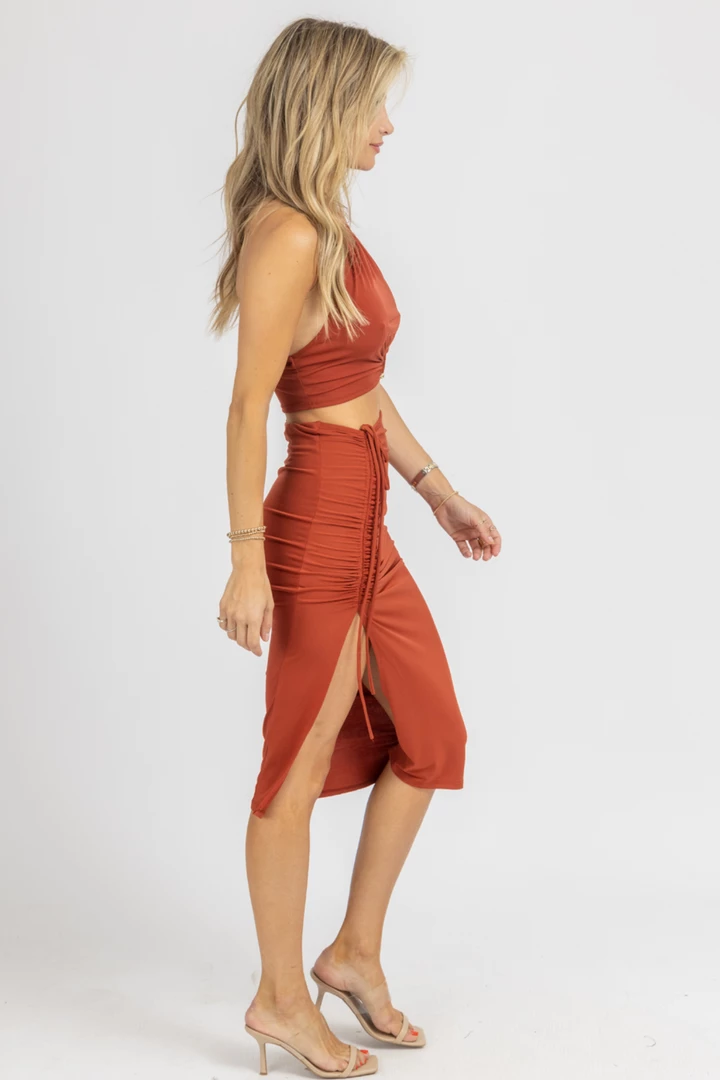 Sold together, High waisted, Midi skirt, Side shirred detail, Slit, Fitted, O-ring crop top with halter tie detail