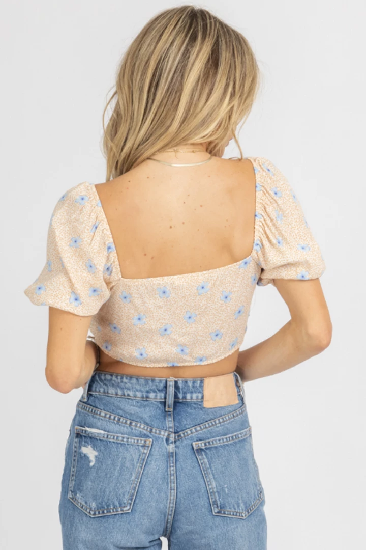 Off shoulder, Cropped, Floral print, Puff sleeves, Criss-cross tie front