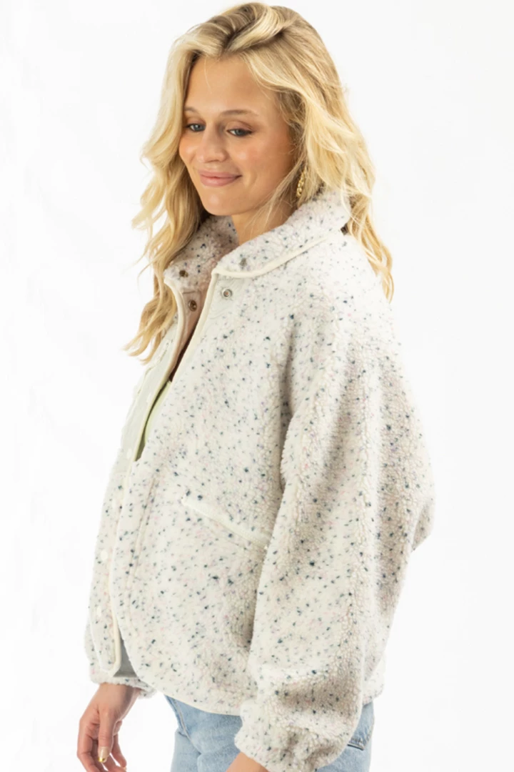 Zippered detail, Snap buttons, Sherpa, Dotted, Front pocket detail, Collared