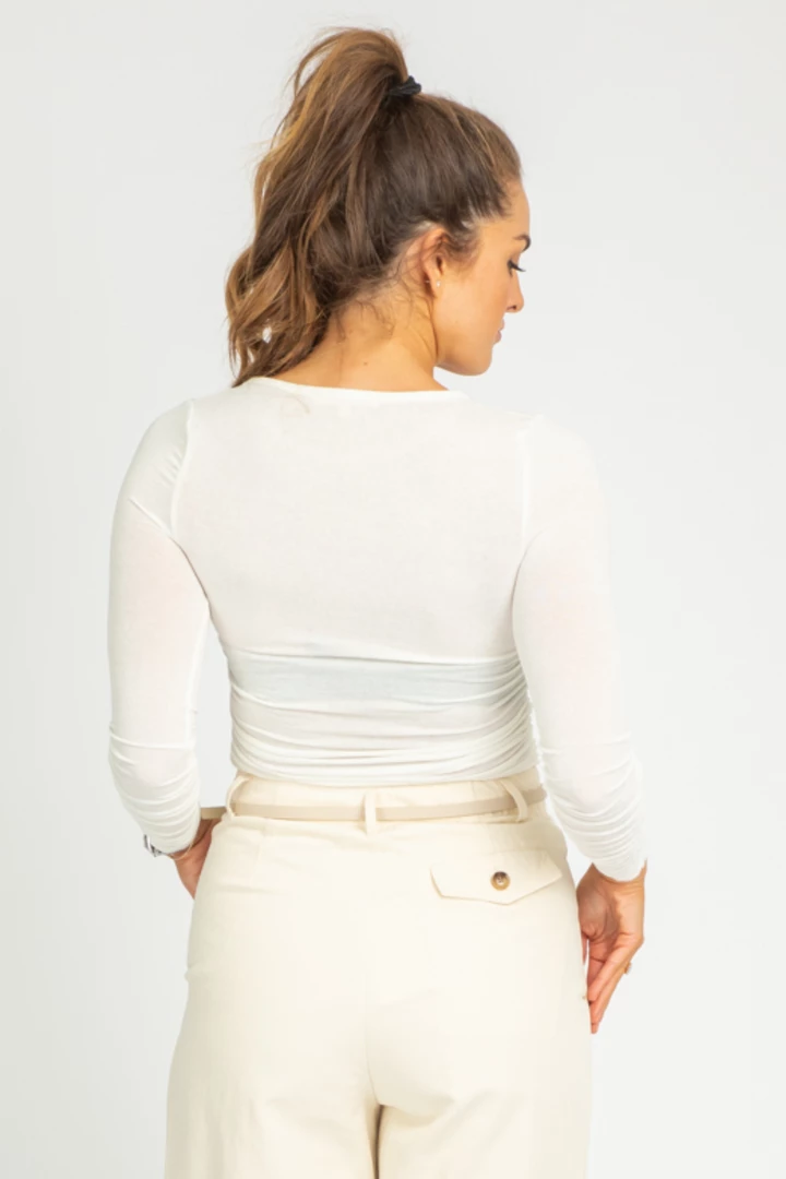 Long sleeve top featuring ruched sides along bodice and sleeves, Crew neck