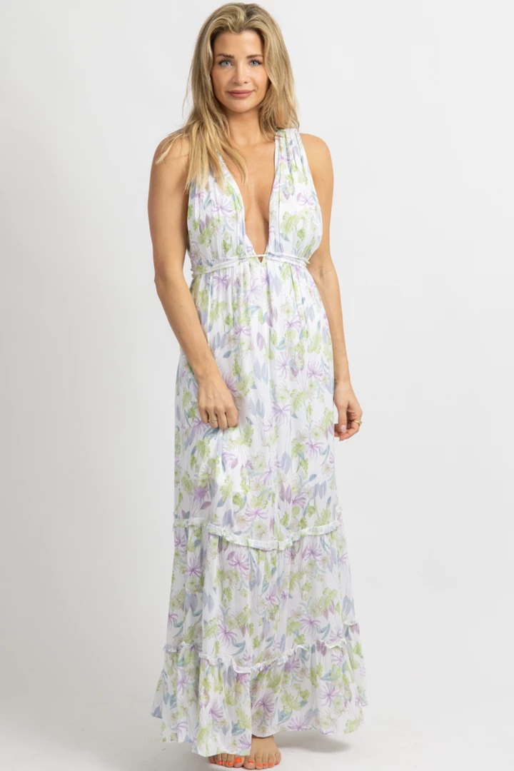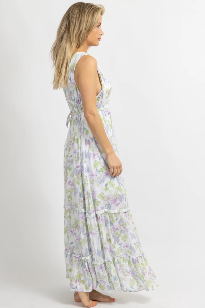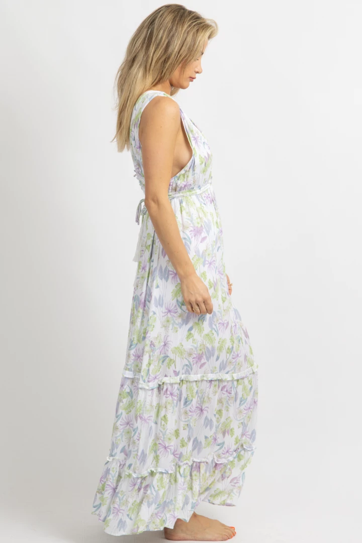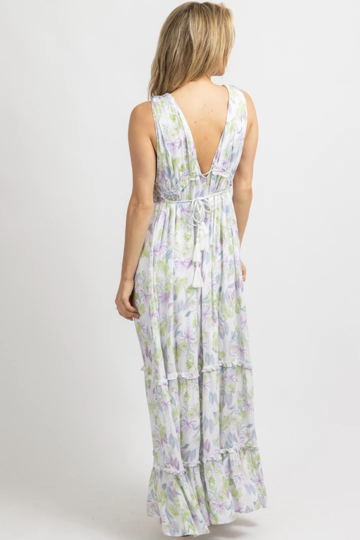 Lined, V-plunge, Adjustable tassel tie, Maxi length, Sleeveless, Ruffled